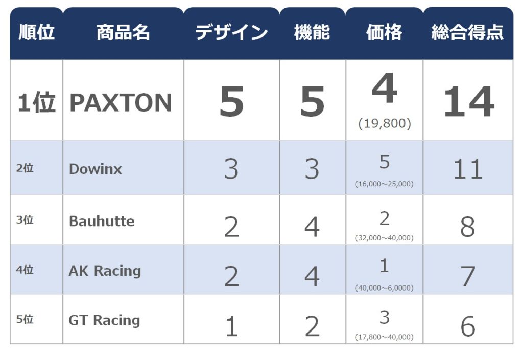 仕事用ゲーミングチェアとして販売しているPAXTON。デザイン、機能、価格、全てにおいて高得点で文句なしの1位です。